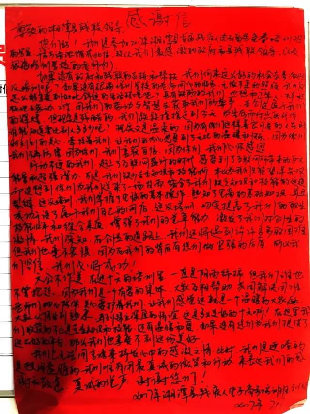 红纸黑字写出来的感谢信,句句真诚,字字感人,深切地表达了学员们对县残联和银海培训学校的感激之情,被残联领导张贴于宣传栏供人浏览。
