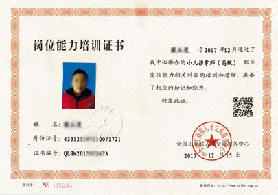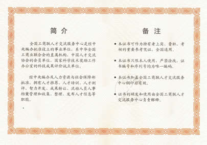 证书持有者表明已经通过全国工商联人才交流服务中心组织的相关专业能力测评,具有相应的专业技能和专业知识,可作为劳动者岗前培训、专业能力提升培训、技术能力提升培训、继续教育的职业技能凭证,,全国通用。该证书编号为唯一编号。有效性可通过全国工商联人才交流服务中心(http://www.gslhr.org.cn/)查询。